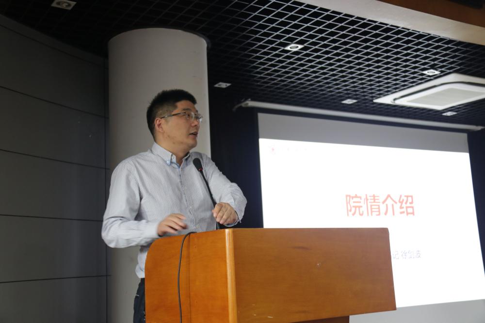 徐剑波作院情介绍。他从发展脉络、师资队伍、教学成果、科研发展、国际化建设、学院文化等方面全面介绍了学院的历史、当前发展的情况以及学院对未来的展望,使新进教职工们对学院有了更直观的了解。