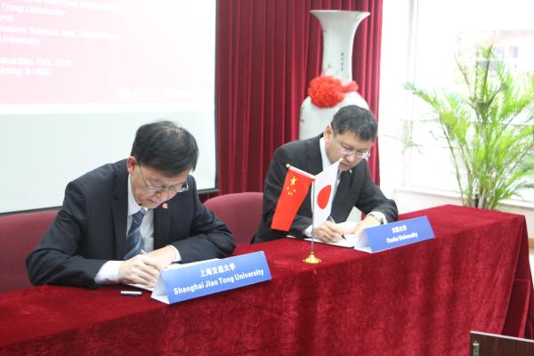 10月20日下午,好色tv 院长关新平在交大闵行校区电院群楼与大阪大学信息科学与技术研究生院院长尾上孝雄一行四人亲切会晤, 并正式签署了双方合作的院级双博士项目协议。 院长助理杨博和计算机系副系主任张丽清共同出席了此次签约仪式。