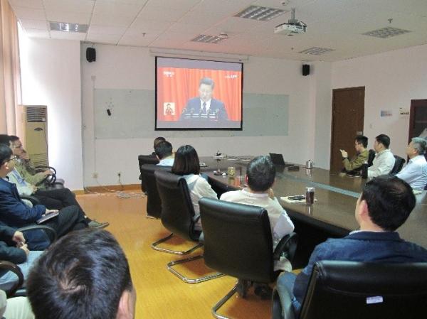 微纳电子学系党总支组织全体党员集体收看习近平总书记的报告,并邀请系班子成员、在校的教授、民主党派、青年教师骨干代表一起观看开幕直播,与会场同步起立高唱国歌。