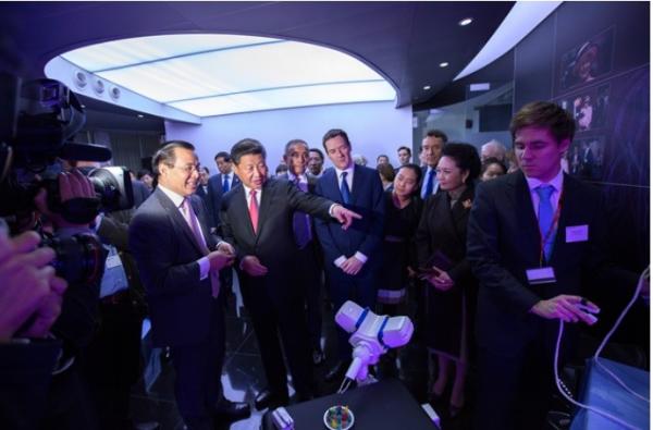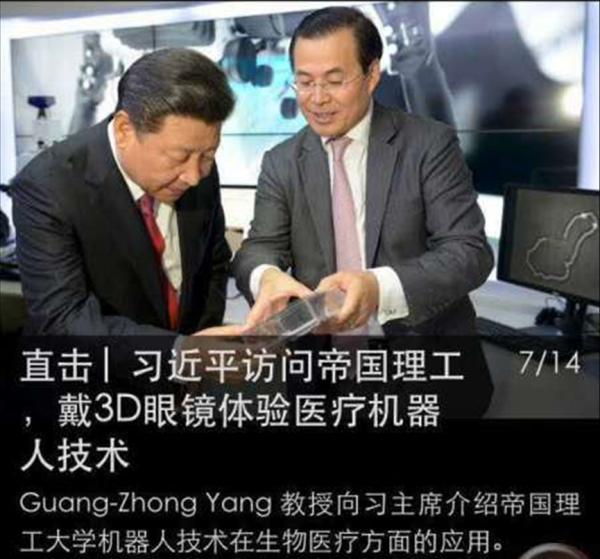 杨广中向习近平介绍了帝国理工学院的研究如何帮助医生们使用更便宜、更精准的医疗机器人为病人提供服务。随后,习近平及随行的约克公爵、财政大臣奥斯本还分别与最新的医疗机器人进行互动,了解它们在外科手术中的应用情况。