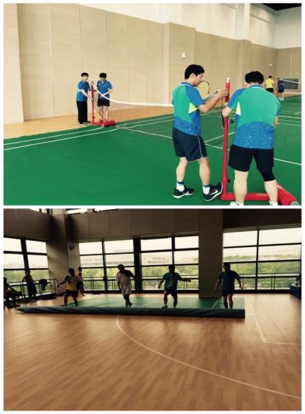 5月31日下午,交大电院与航天八院的球队成员在中广核的羽毛球场上展开了一场激烈的羽毛球友谊交流赛,这也是刚刚成立的电院羽毛球队迎来的第一场交流赛。虽然因为沟通问题,比赛延迟半小时开始,场地也暂未铺好,但是这样的小插曲丝毫没有影响到大家的热情。在双方队员的共同协作下,不到十分钟的功夫大家就将一个标准的室内篮球场,改造成了四片羽毛球塑胶场地。
