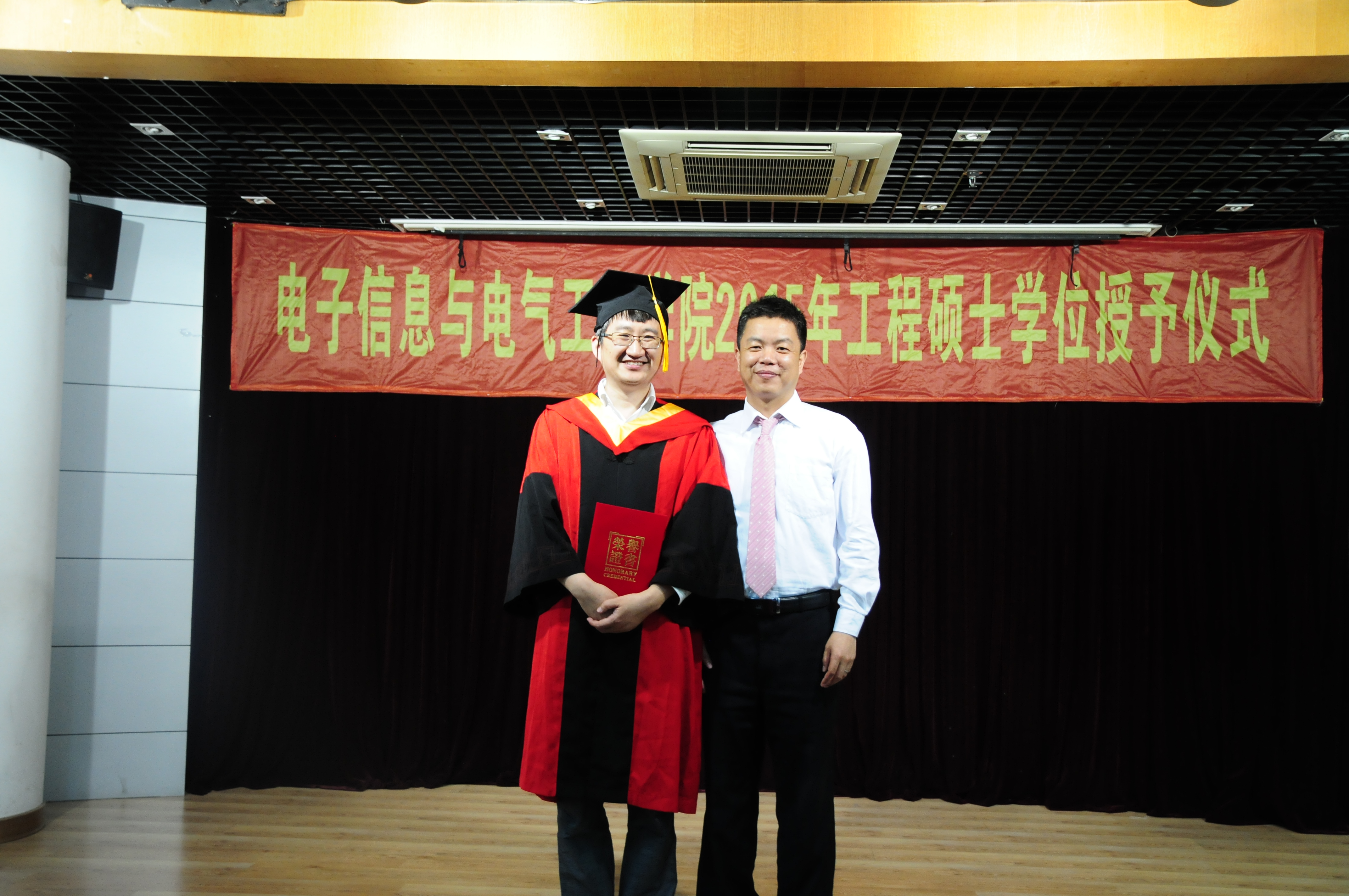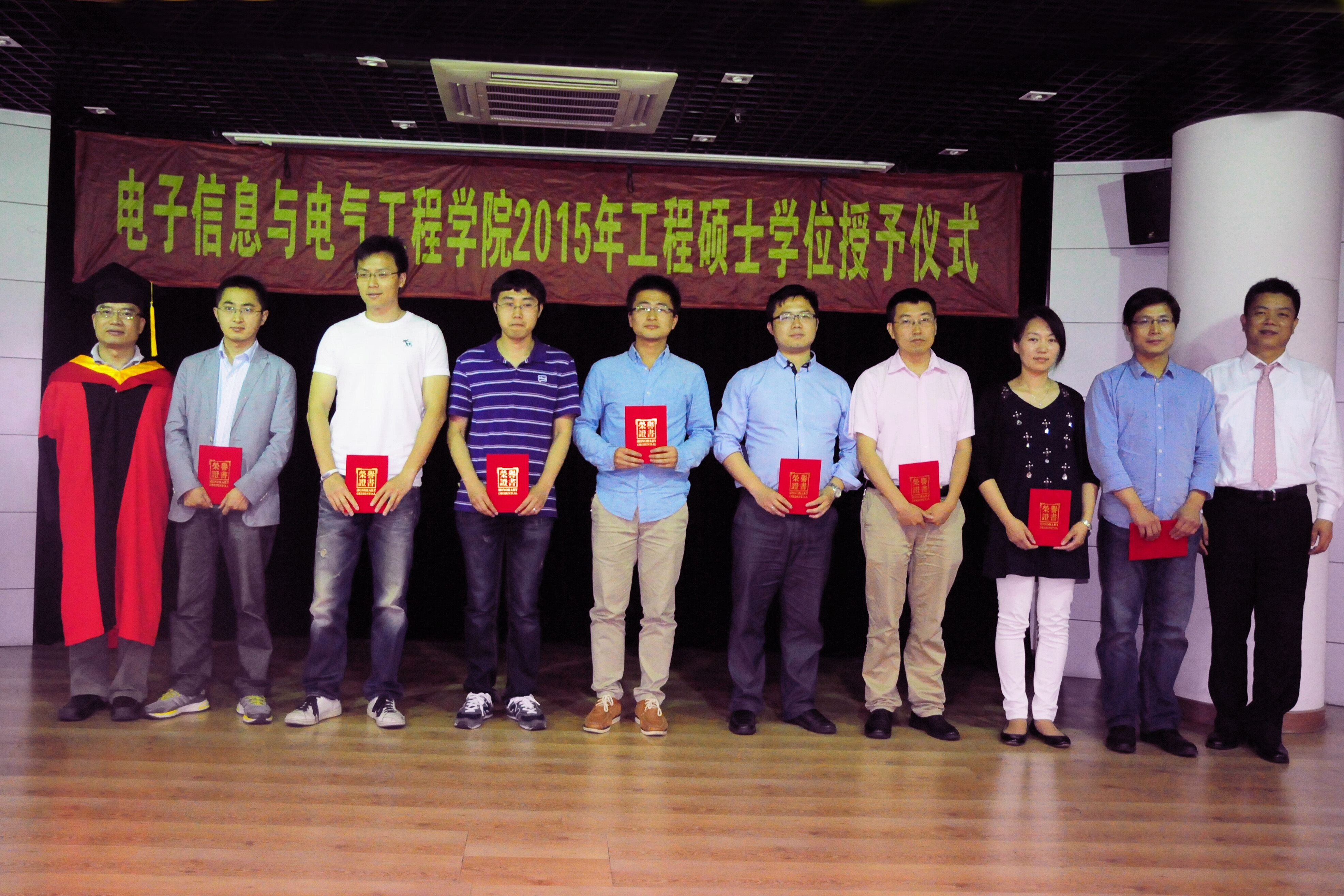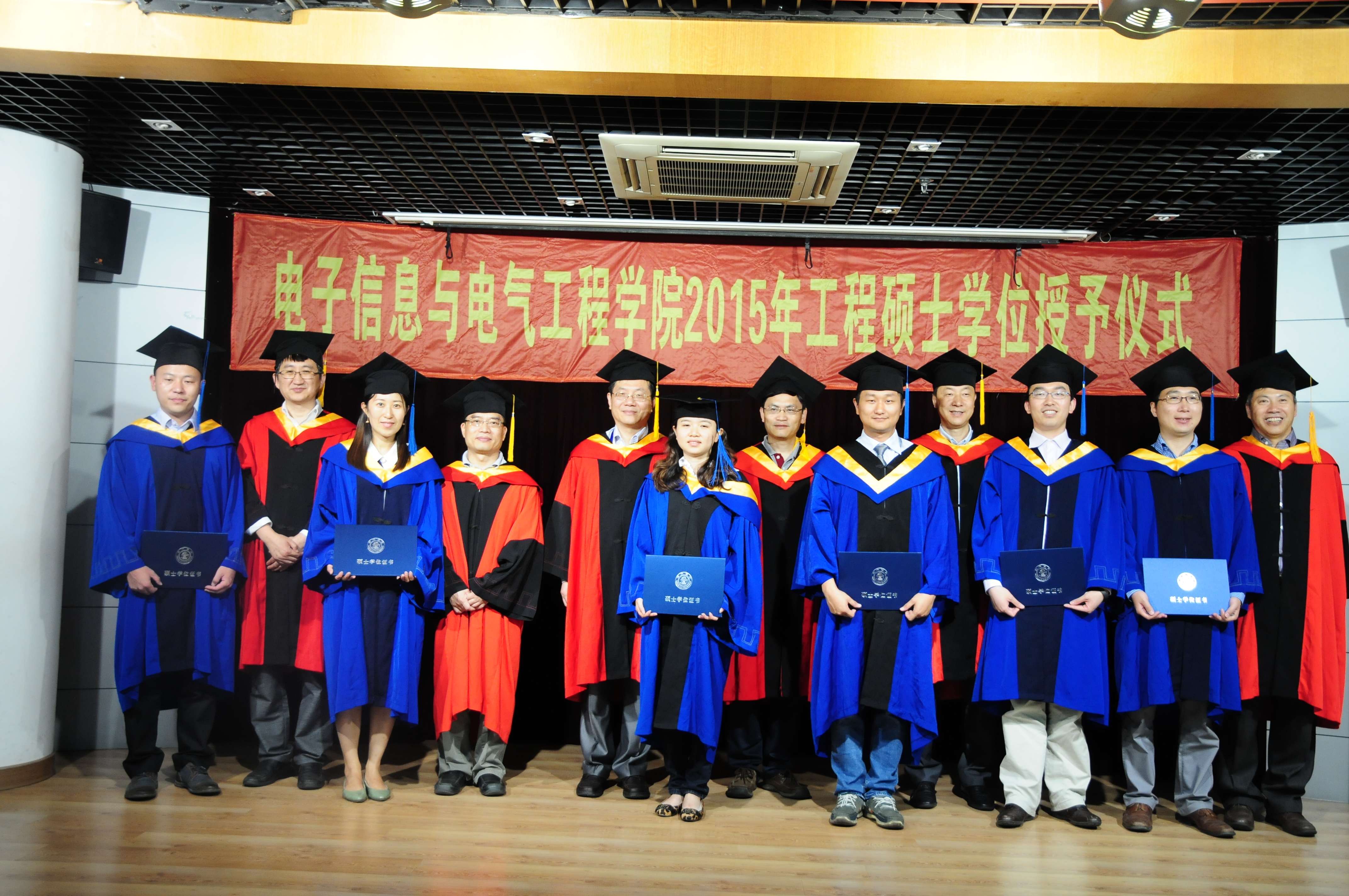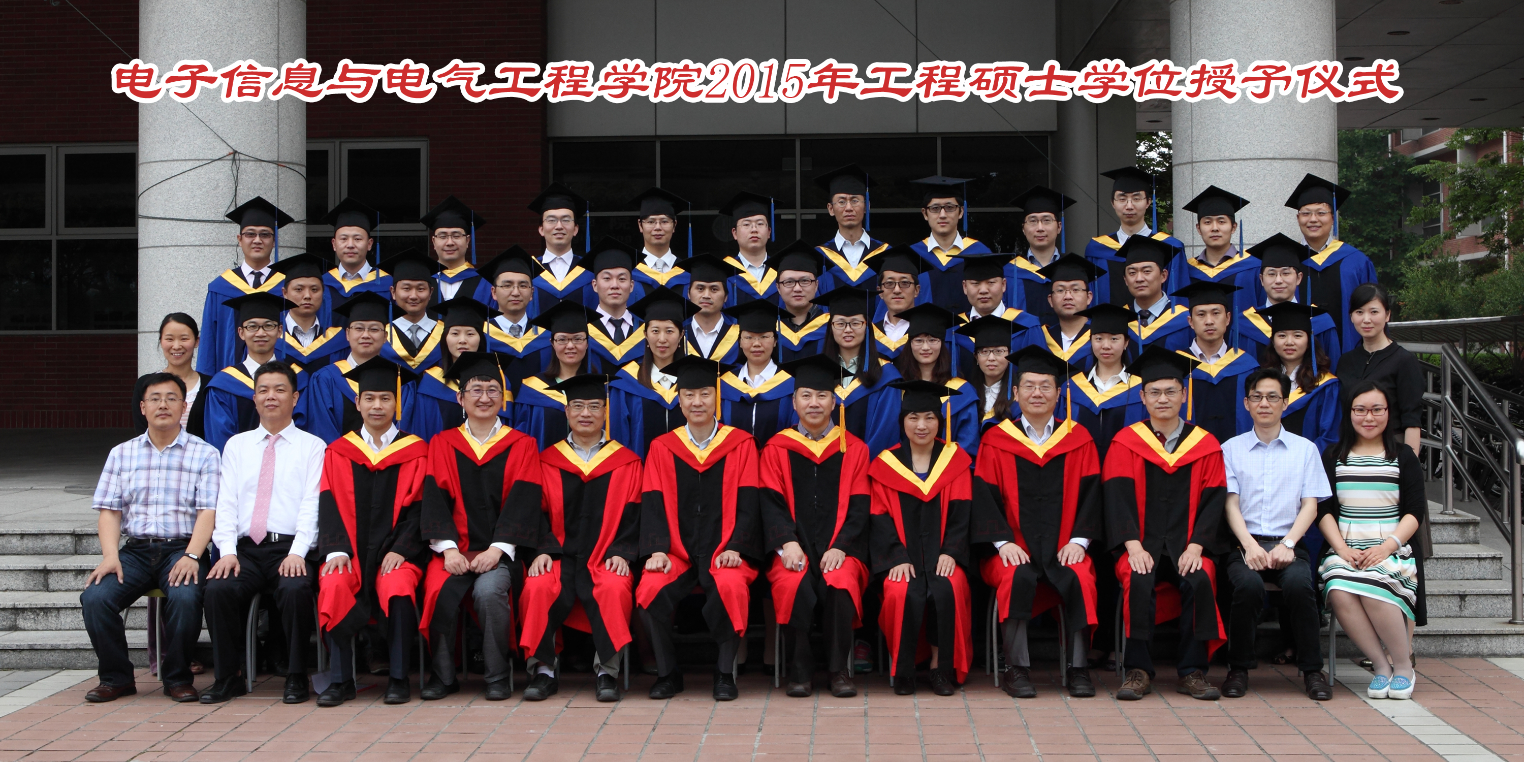 2015年5月23日,好色tv 2015年工程硕士学位授予仪式在电院楼群报告厅隆重举行。学位授予仪式由电院副院长邰能灵主持。研究生院副院长杨根科、电院党委书记苏跃增、党委副书杨一帆、电气系主任严正、先进电子材料与器件校级平台(AEMD)主任苏翼凯,导师代表张忠能,宝钢首席研究员兼特聘导师郭朝晖,思源电气股份有限公司总经理助理李忠华,昆山龙腾光电有限公司人力资源部经理谢能才等出席了典礼。