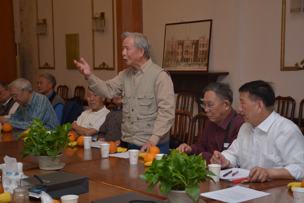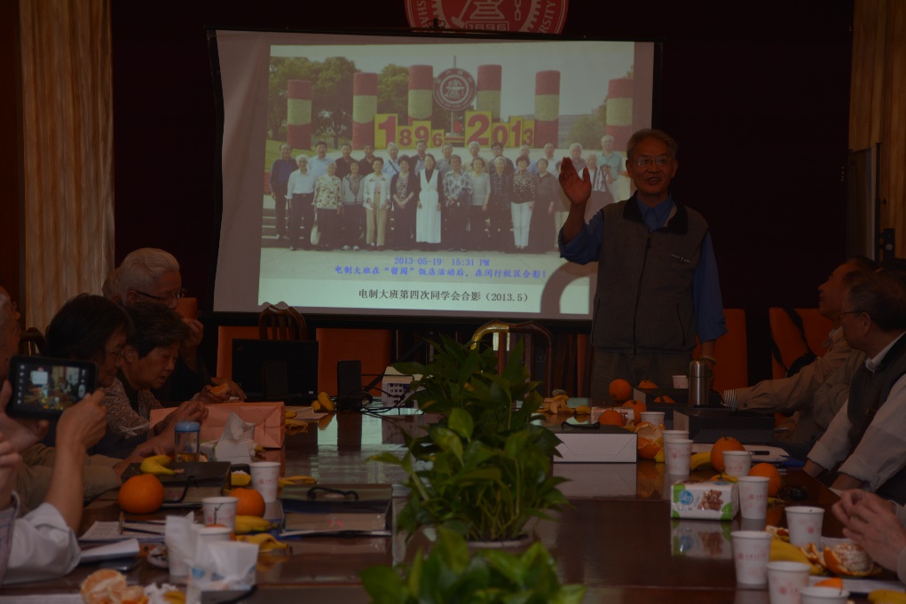 上午9点30分茶话会正式开始,校友们首先观看了倪学长悉心制作的PPT。他向大家展示了电制专业55级校友60年来的风貌,其中包括许多珍贵的老照片。图片中都是当年风华正茂,指点江山的莘莘学子,看到此处许多校友纷纷走近屏幕寻找着自己当年的身影。随后,几位毕业后第一次参加聚会的老校友们都发表了讲话,回忆当年入校的情景,感慨时代的变迁,同窗缘分的可贵。周康达校友详细描述当年考上交通大学的不易以及自己报考交大时的心情,回忆自己接到录取通知书时高兴的都跳了起来。宋慕渝学长总结了四个字来形容大家参加同学聚会时的心情:忆、情、纯、恋,引起了在场所有人的共鸣。薛继汉校友讲述了自己毕业后的人生经历,并且倾情作诗一首献给当天的第五次同学聚会:“有幸考进大学堂,莘莘学子奏学章,吴侬软语舒心境,关中秦腔豪气爽,甲子一轮又聚会,挚友频频道健康,相聚惜别欢恨短,再读五年又何妨,”表达了自己对母校的热爱之情以及老友重逢的激动心情。