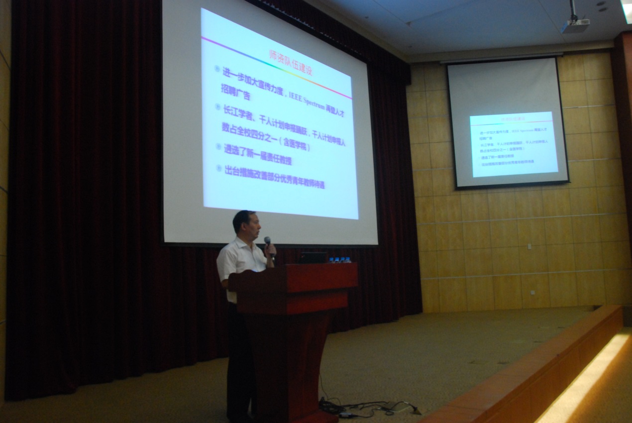 之后,苏跃增传达了学校党委九届十四次会议精神,回顾了大电类学科群的改革进程,在对学院组织架构、学科建设、师资队伍等方面进行深入分析的基础上,提出学院要继续强化团队建设、加强青年人才引育、加强组织协调、提高执行力,要在融合中凝聚共识,在压力下谋求发展,进一步加强学院文化建设,实现相互融合,共同发展,齐心协力建设一流电院!
