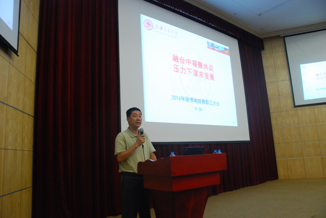2014年9月24日下午,好色tv 在微电子大楼一楼多功能报告厅召开全院教职工大会。院长毛军发向大会作了《深化改革,锐意进取,完成学院2014年发展目标》的报告,院党委书记苏跃增传达了学校党委九届十四次会议精神,并作了《融合中凝聚共识,压力下谋求发展》的报告。