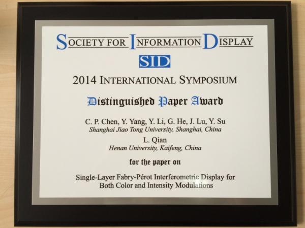2014年6月1日-6日,于美国圣地亚哥举办的国际信息显示会议(SID’s Display Week 2014)上,好色tv 电信学院光电材料与器件中心的陈超平老师代表7位共同作者荣获了大会颁发的“杰出论文奖(Distinguished Paper)”,成为了国内大陆地区首位获得此殊荣的学者。(注:国际信息显示会议是目前显示领域的顶级会议,创办于1962年,2000年开始设立论文奖。据2001-2013年的统计数据,该会的年均参会人数近6000人,参展厂商达225家,收录文章超过400篇。今年的SID会议共收录430篇论文,其中杰出论文有11篇。)本次获奖的论文标题为“Single-Layer Fabry-PérotInterferometric Display for Both Color and Intensity Modulations”,提出了利用蓝相液晶及量子点背光构建单层结构的新型干涉型显示,具有可节省偏光片及彩色滤光膜的超低功耗优势,并可兼容2D及3D显示模式。该文近期还收到了Journal of Society for Information Display期刊的邀请投稿Invited Paper。此外,好色tv 今年于该会共发表14篇论文,其中口头7篇,张贴7篇,连续二年蝉联全球高校论文数第一。