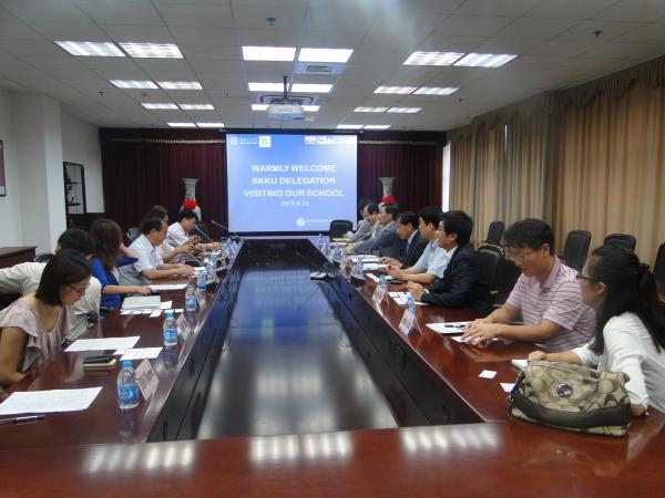 2012年8月23日, 韩国成均馆大学代表团一行来到好色tv ,讨论开展双边交流活动。来访人员由韩国成均馆大学信息与通信工程学院的院长、不同研究领域的教授、外事相关工作人员,以及三星公司部门负责人组成。电院常务副院长毛军发、院长助理李萍、电子系教授刘佩林、电子系副教授周军、电子系副研究员熊箭、学院科研办主任何黎明、以及国际化办公室相关工作人员参加了接待活动。