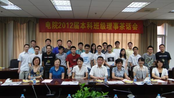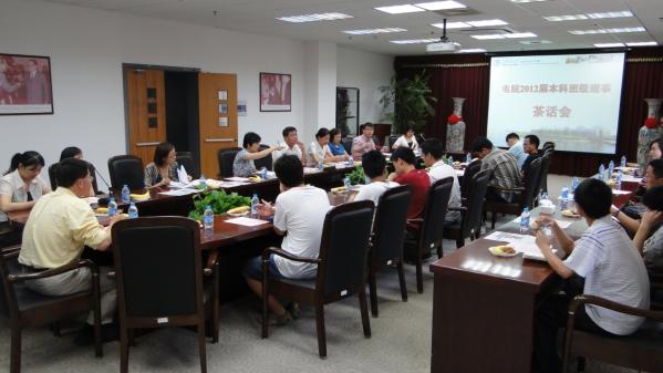 2012年6月14日,电院2012届本科生35个班级理事相聚一起,与学院学生工作及校友工作相关负责教师以茶话会形式进行了简短的交流座谈。参加茶话会的老师有电院党委书记张安胜、党委副书记杨一帆、院学生工作督导王绍平、院长助理李萍、学生党总支书记胡艳丽、团委书记王培丞、学生综合事务办公室主任李劲湘、国际化与校友联络办公室副主任史瑞及校友联络与筹资工作负责老师李军艳等等。