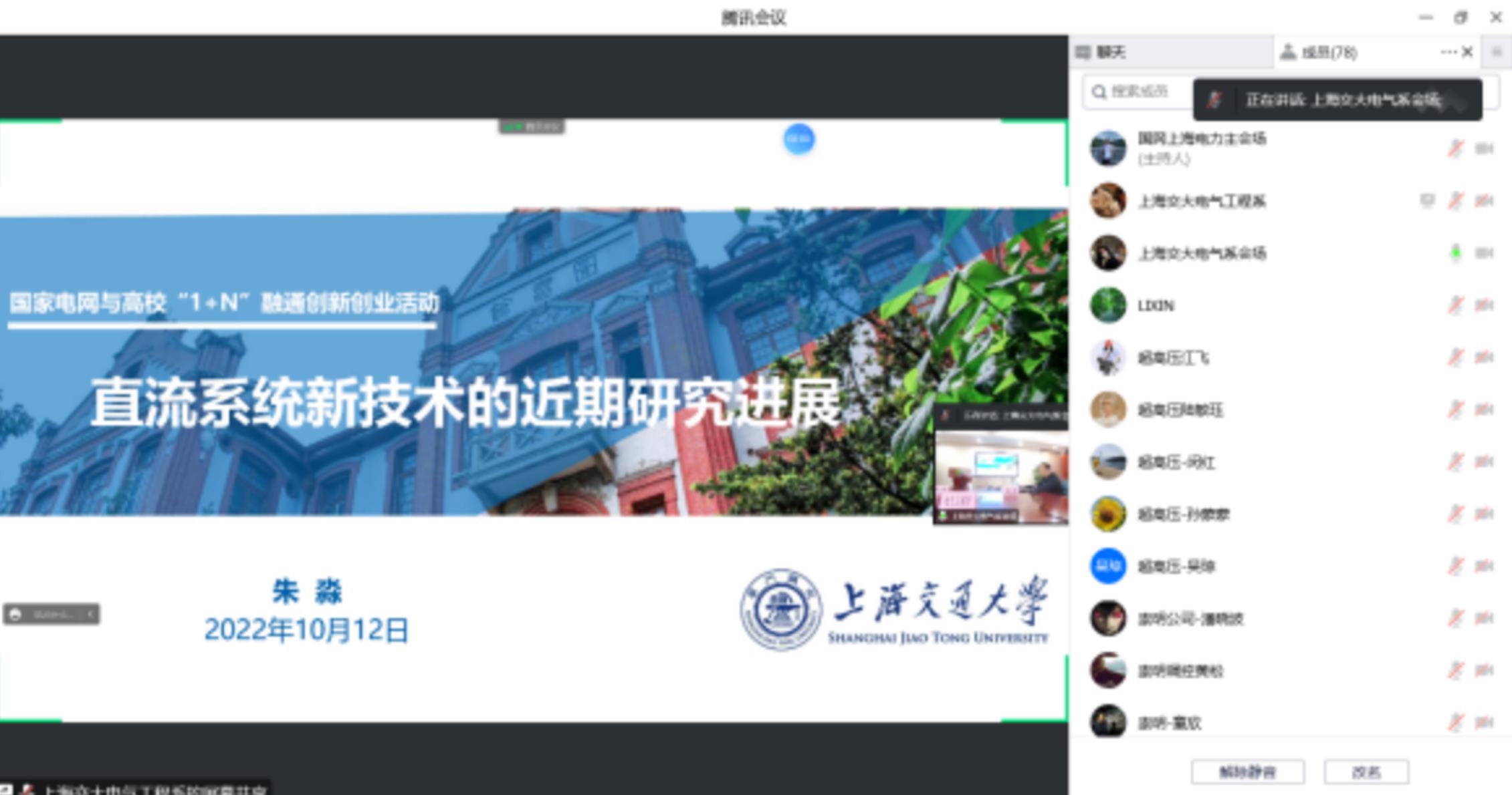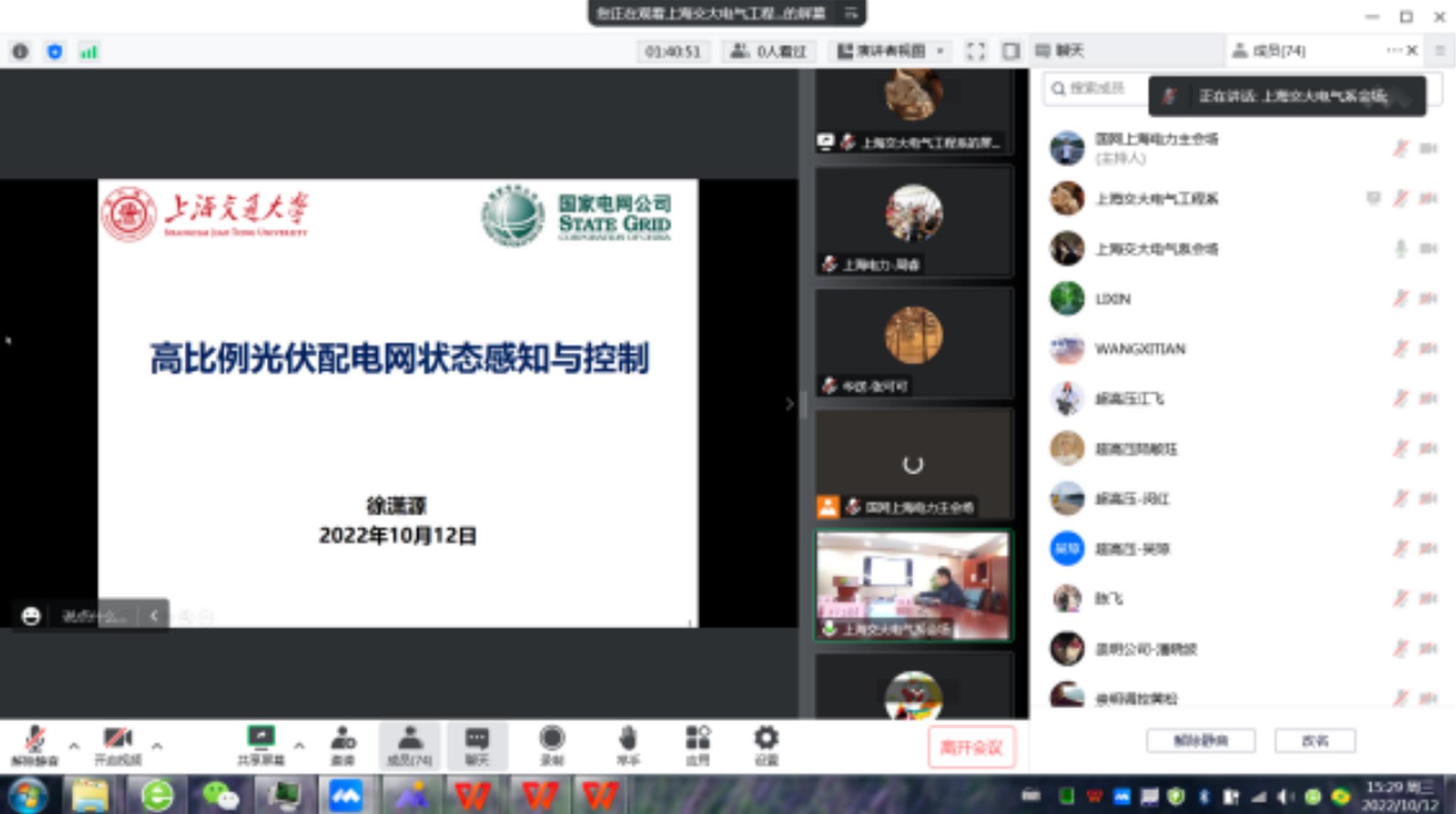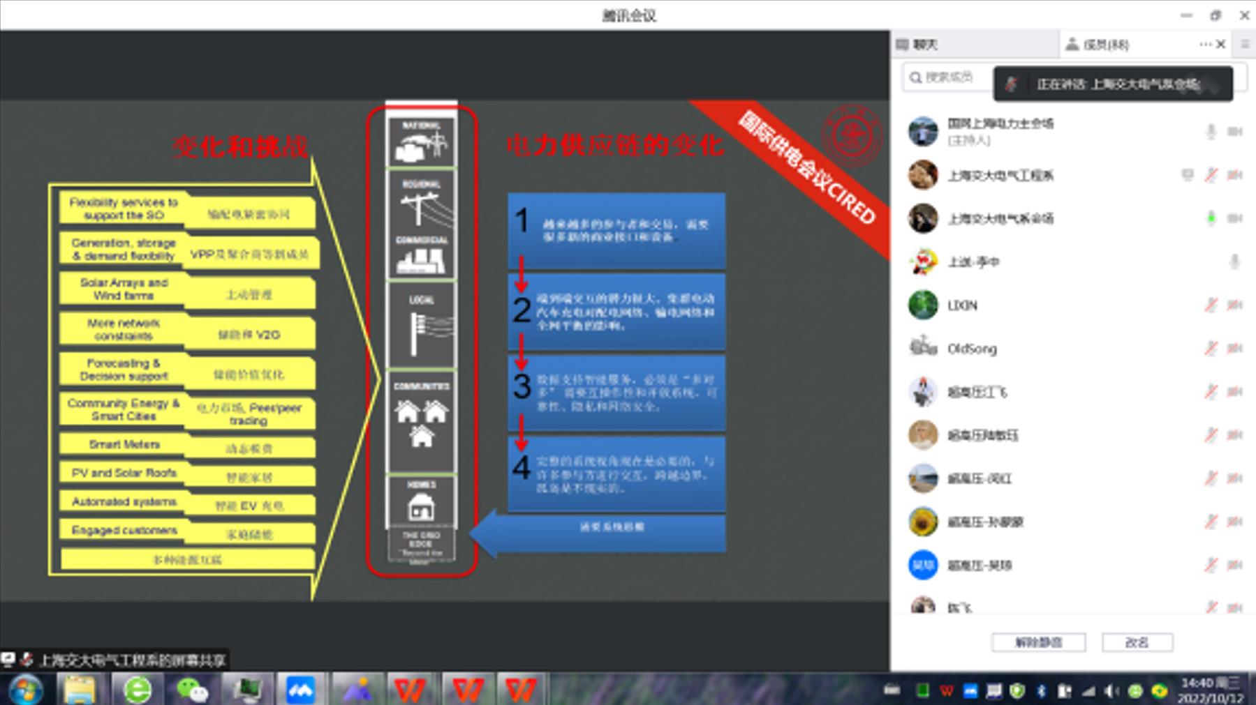 10月12日,“2022年国家电网与高校‘1+N’融通创新创业活动日-好色tv 专场活动”通过视频方式火热开展,近百余位国网上海市电力公司的科技工作者与好色tv 电院电气工程系师生代表通过思维碰撞,共享学术盛宴。本次活动主题定为“校企‘沪’融新生态、‘电’亮双碳新时代”,适逢第53届世界标准日来临在即,双方通过技术对接、标准分享、人才共育三个环节,开展了一系列学术交流及分享活动。国网上海市电力公司科技部黄兴德副主任、好色tv 尹毅副院长、电院电气工程系朱淼书记、刘东教授等专家参与了此次活动。