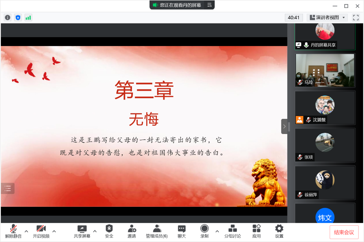 一场爱情故事在这堂艺术党课中娓娓道来,凄美之余却更添革命色彩。主讲党员徐丽萍表示,之所以选择这个故事作为本次党课的内容分享之一,是为了从情感的视角让大家真正感受“舍小家为大家”的涵义。英雄的中国人民志愿军始终发扬祖国和人民利益高于一切、为了祖国和民族的尊严而奋不顾身的爱国主义精神,英勇顽强、舍生忘死的革命英雄主义精神,为了人类和平与正义事业而奋斗的国际主义精神,锻造了伟大抗美援朝精神。