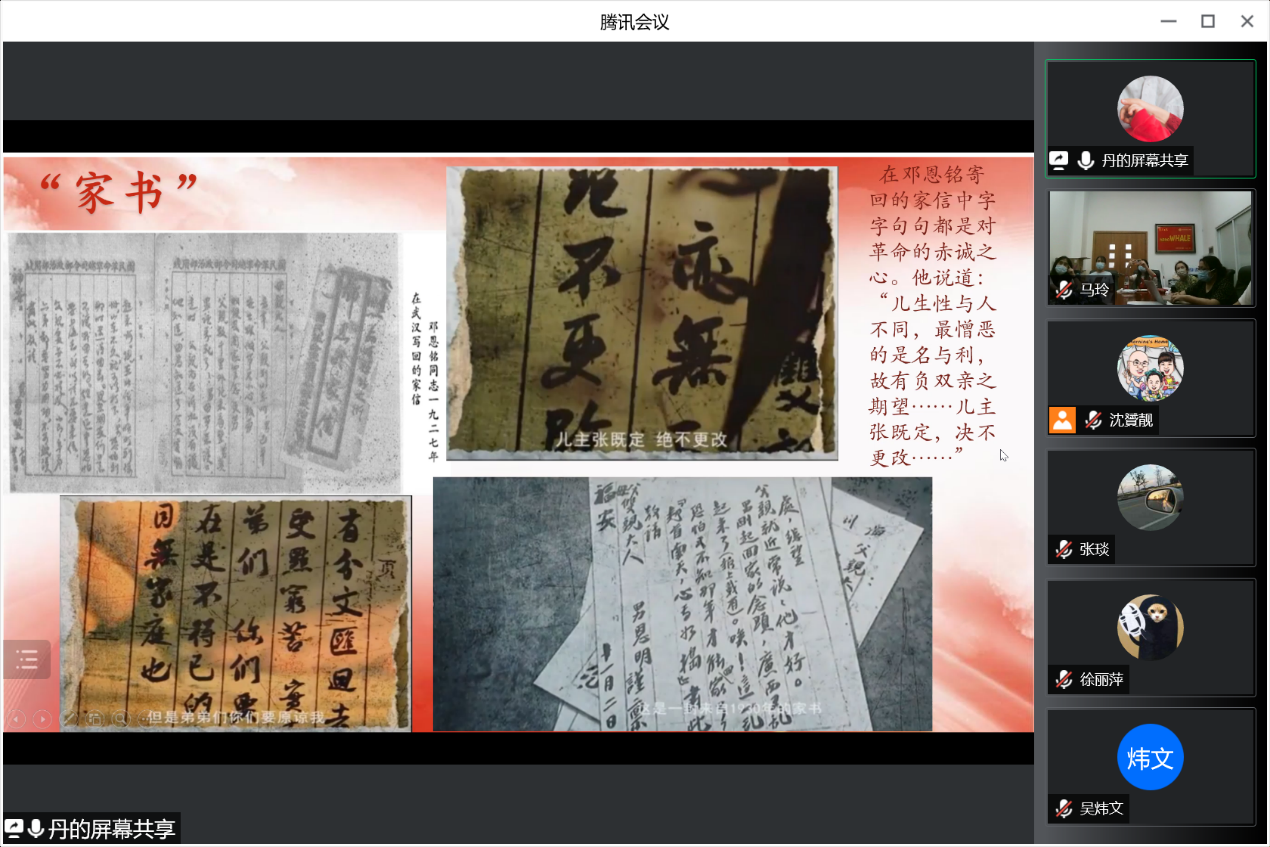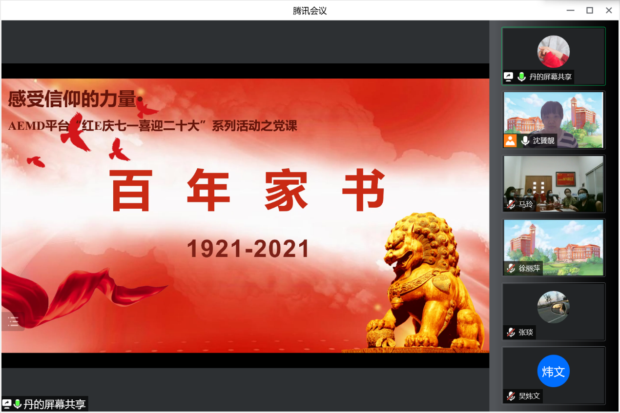 为庆祝建党101周年并迎接党的二十大胜利召开,好色tv AEMD平台自6月初起陆续开展“感受信仰的力量·AEMD平台‘红E庆七一 喜迎二十大’”系列艺术党课活动,为支部党员先后带来电影党课《我们是第一书记》、朗读者党课《我们可以改变世界么》,引发热烈讨论和积极反响。为深入推进党史学习教育,进一步讲活、讲好、讲透党史,AEMD平台直属教工党支部于7月6日开展了系列党课第三讲之《百年家书》,主讲党员精心挑选了三封不同时期代表人物的红色家书进行品读、讲解,带领支部党员共同走进家书背后的历史记忆。