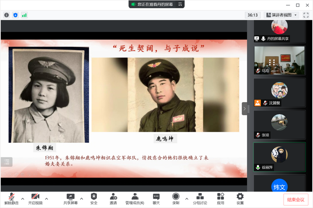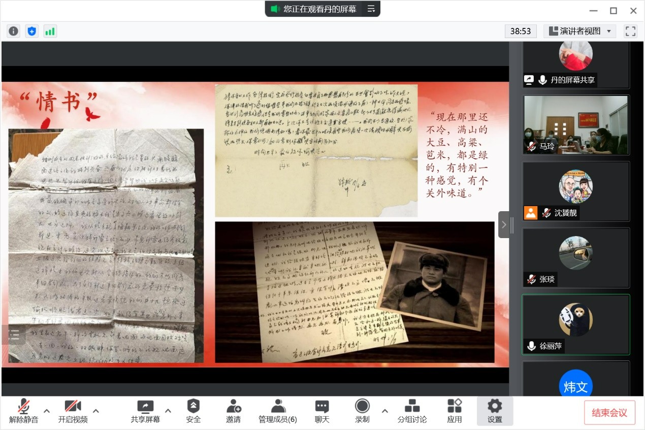 接着,支部党员徐丽萍带领大家走进第二个家书故事,这是一个为爱等待一生,用55年时间兑现初恋诺言的革命爱情故事。“您走了快70年了,我虽然不能代替您,为国家为民族做更多的好事,但是我一直在努力地做好事”,这是2020年,87岁的朱锦翔奶奶深情寄语牺牲在朝鲜战场上的未婚夫鹿鸣坤时说的话。1951年12月,鹿鸣坤牺牲在抗美援朝的战场上,他们的青春和革命爱情也永远定格在了那时候。翻开两人互通的信件,鹿鸣坤这样写道,“锦翔:你能针对我的思想来帮助我,我有这样一个人经常帮助我,工作会更起劲,改正缺点更快,你的帮助是真正的从革命利益出发……”没想到这封信竟是绝笔。