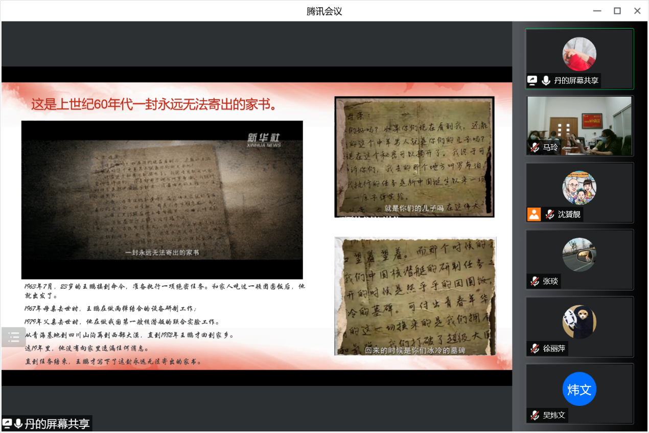 支部党员刘丹最后为大家带来了一个“两弹一星”研制参与者王鹏的感人故事。“现在的祖国,‘可上九天揽月,可下五洋捉鳖。’国家、军队的强大离不开每一个人,党的建设同样离不开每一位共产党员。作为一名老党员,我能做的,就是将‘热爱祖国、无私奉献,自力更生、艰苦奋斗,大力协同、勇于登攀’的‘两弹一星’精神继续传递下去。” 1963年7月,23岁的王鹏接到命令,准备执行一项绝密任务,匆匆和家人吃过一顿团圆饭后他就出发了。从青海基地到四川山沟,再到西部大漠,这19年里,他没有向家里透漏任何消息,直到任务结束,王鹏才写下了这封永远无法寄出的家书。这是王鹏“杳无音讯”离家十九载后写给早已亡故的父母的一封家书,既是对死去父母的告慰,也是对祖国伟大事业的告白。无数像王鹏一样的人,将名字“深埋”在岁月里,在“春风不度”的戈壁滩上冒高温、顶沙尘、住土屋、挤帐篷、喝咸苦水。荡漾的青春年华,浇灌出一节节华夏的脊梁,他们无怨无悔。