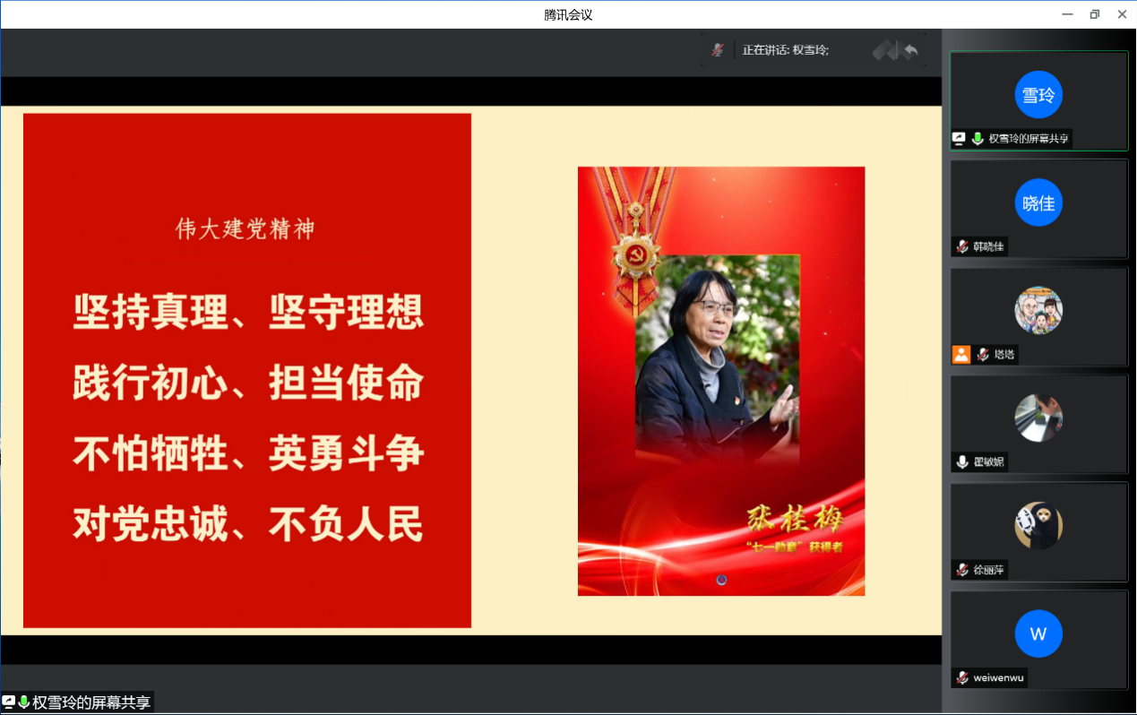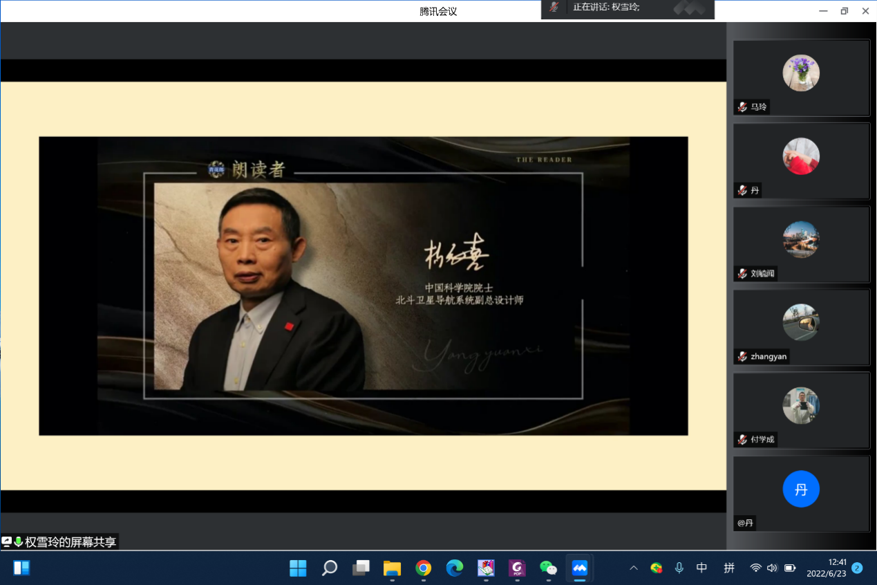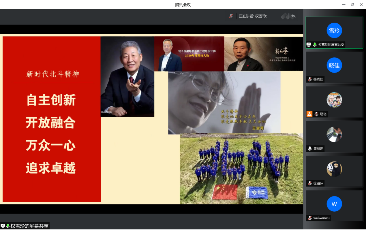 支部党员权雪玲首先讲述北斗导航系统副总设计师、中国科学院院士杨元喜的“北斗”故事。从北斗工程立项伊始,天南海北的建设者们便怀揣激情和梦想汇聚到北斗研制建设一线,他们干惊天动地事、做隐姓埋名人,不分前方后方、不分台前幕后,共同谱写了重大航天工程“举国上下一盘棋、千军万马大会战”的火热篇章。“自主创新、开放融合、万众一心、追求卓越”是新时代北斗精神,也是北斗工程的追求目标。
