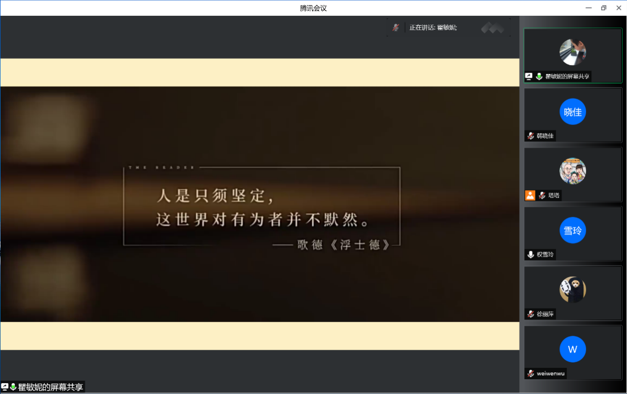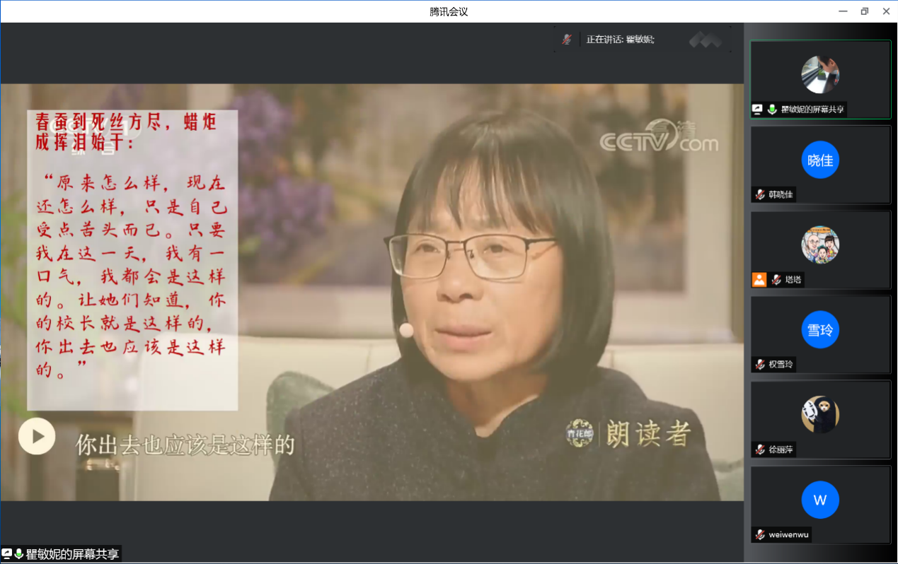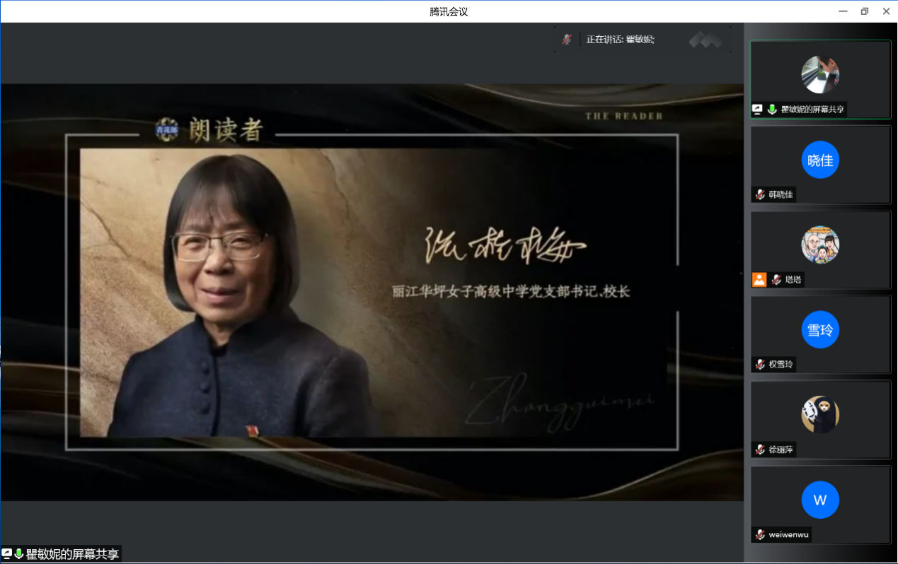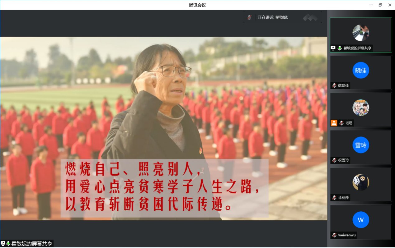 支部党员瞿敏妮接着为大家分享丽江华坪女子高中党支部书记、校长张桂梅的教育故事。张桂梅的丈夫胃癌去世,为了从丧夫之痛中走出来,她被调到华坪县一个民办中学。谁曾想,从此她的人生就与山里的女孩们命运相连。为了帮助那些因贫困无法读书的女孩们,张桂梅想到要办一个免费高中女子学校,让她们都能有书可读,用教育阻断贫穷。