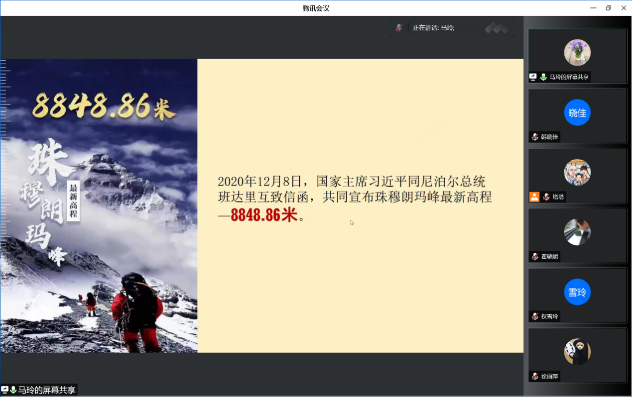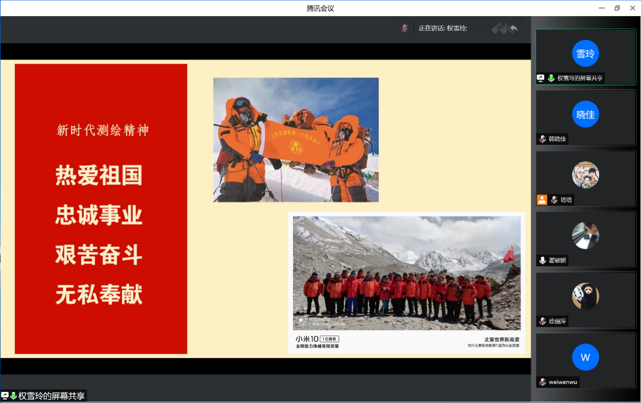 最后,支部党员马玲为大家带来了国测一大队老队员郁期青的“测绘”故事。要想改变世界,我们必须先了解世界。中国有多大,珠峰有多高,黄河有多长……这些宝贵且准确的数据,是由一群测绘工作者用脚步丈量出来的。正是有了他们,我们国家的崇山峻岭、荒野戈壁、江河湖海、原始森林从此有了精准的坐标。