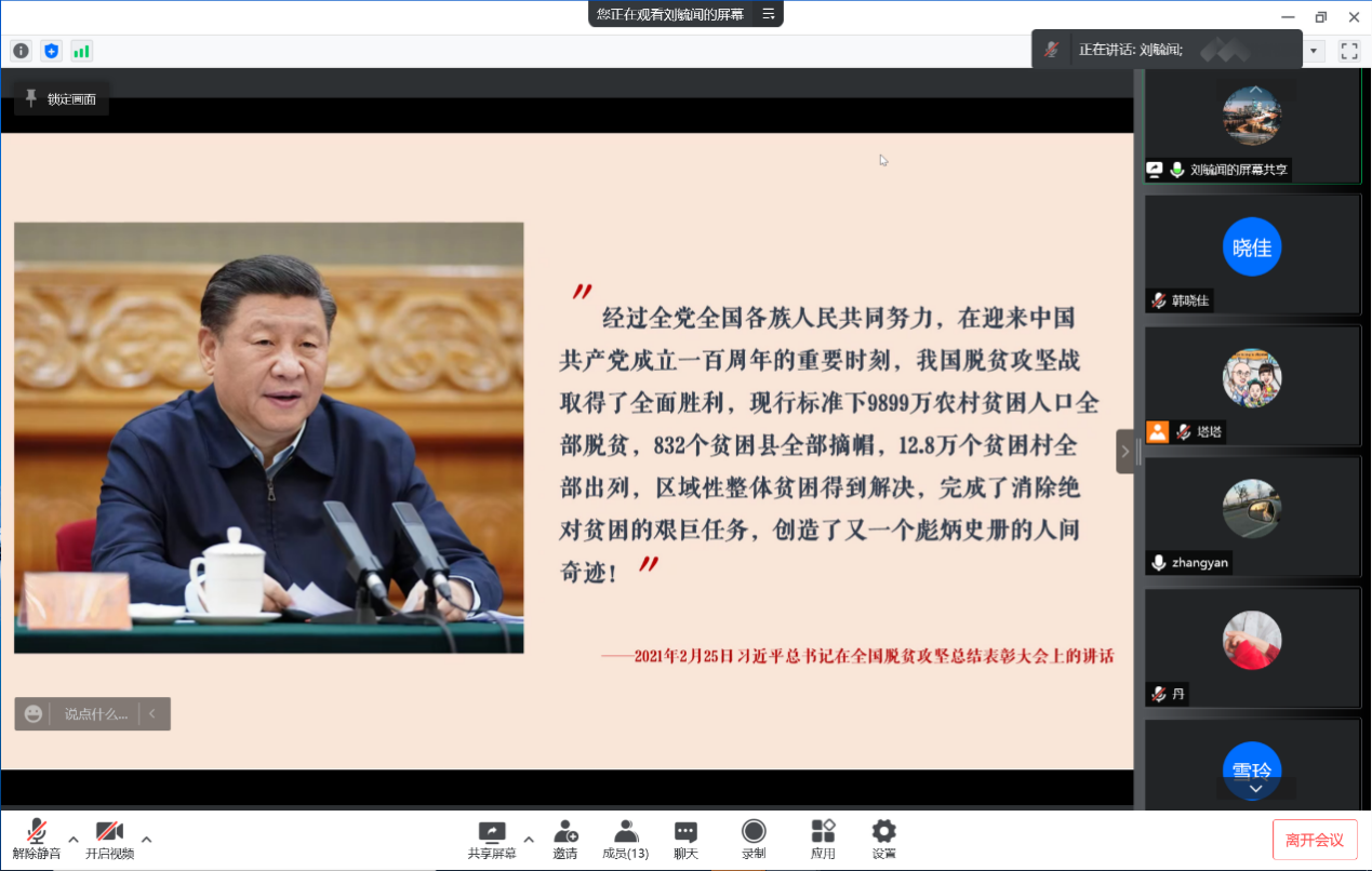 首先,支部书记刘毓闻介绍了电影《我们是第一书记》的创作背景,和大家共同感悟脱贫攻坚精神的内涵与意义。刘毓闻从我国面临的脱贫攻坚任务的艰巨性、党中央如何指导脱贫攻坚工作、“第一书记”的职责与使命等方面,和大家一起走进脱贫攻坚这个没有硝烟的战场。从2012年底党的十八大召开后新时代脱贫攻坚的序幕展开,到2013年党中央提出精准扶贫理念,再到2020年9899万农村贫困人口全部脱贫、832个贫困县全部摘帽、12.8万个贫困村全部出列,这是一场以生命共赴的使命。