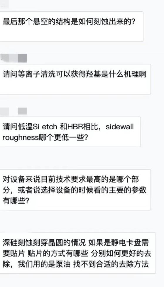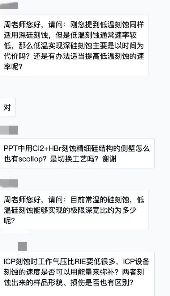 本次讲座吸引了250余人参会。讲座结束后,主讲人与AEMD平台用户就干法刻蚀中的各种问题进行了深入交流互动,热烈讨论了刻蚀缺陷、大深宽比刻蚀的方法、终点探测方法、刻蚀形貌的侧壁陡直度、均匀性等AEMD平台用户关心的话题,为用户解答了工作中遇到的实际问题。平台用户对相关技术问题畅所欲言,接二连三地提出相关疑问,主讲嘉宾热情仔细地一一回应,交流互动环节掀起一阵又一阵头脑风暴。