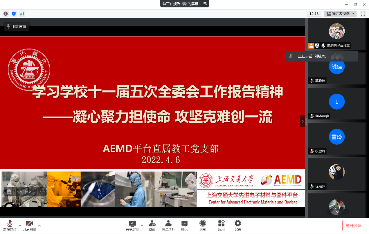与会党员纷纷表示,国家安全涉及方方面面,信息安全、网络安全、环境安全、社会安全、文化安全等等均囊括其中,安全无小事,作为AEMD平台的一名党员,既要有时刻保证实验室安全的自觉,也要有全面维护网络安全、信息安全等的意识和能力。在观看教育片《初心——家国》后,其中所折射出的各行各业的家国情怀同样深深触动了党员同志。平台主任程秀兰表示,“每一座巍峨壮美的雪山都是由一片片雪花堆积而成的,涓涓细流终会汇聚成河,作为党员,我们要团结一心、冲锋在前、争党表率,坚决把责任扛起来,为夺取抗疫斗争胜利贡献力量”;平台党员徐丽萍表示,“一代人有一代人的长征,每个时代都有独特的主旋律,作为党员应始终心怀‘国之大者’,真正聚焦时代关切,坚持情系民生福祉,怀着这样的初心深入实践,努力讲好中国故事”;平台支部书记刘毓闻表示,“上海处在防疫攻坚战的关键时刻,正是党员同志应当有令必行、尽锐出战、维护社会安全的时候,不论是参与社区志愿服务,还是利用专业所长为抗疫提供支持和帮助,都是身为一名党员义不容辞的责任,党员同志要把家国情怀融入不懈奋斗,以实际行动,营造‘国家安全、人人有责’的良好社会氛围”。