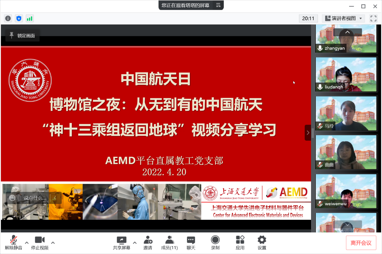 时值第七个“中国航天日”到来之际,平台党支部为了进一步凝聚思想,做到“用思想引导行动,以行动践行思想”,决定将本月第三次理论学习主题定为“夯实行动之源 以飞天梦想引领航天精神”。作为中国共产党人精神谱系的重要组成部分,载人航天精神是极具鲜明时代特征的宝贵精神财富,精神无形,却能激发出无穷的力量,能够激励人负重前行、成就梦想。特别是在这样一个同心抗疫的关键时刻,载人航天精神的引领感召、神舟十三号载人飞船的成功返航,都是对党员同志莫大的精神鼓舞。