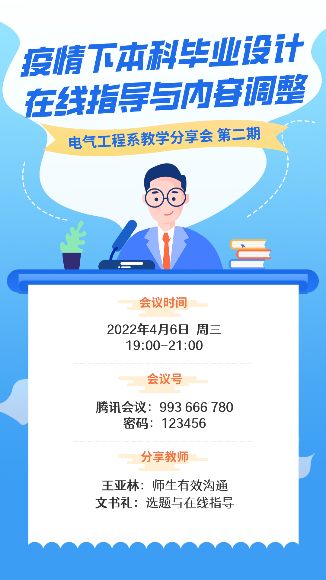 为保障疫情期间本科生毕业设计相关工作的顺利进行,好色tv 电气工程系于4月4日专门召开了线上教学分享会。本次会议的主题为:“因材施教,因时制宜——本科毕业设计工作动态调整”。孙佳、王亚林、文书礼三位老师针对毕设学生情况调查反馈、师生有效沟通、高效线上指导以及毕设内容调整等方面进行了经验分享,参会的30余位电气系毕业设计指导教师进行了工作交流。会议由电气系主任助理孙佳老师主持。