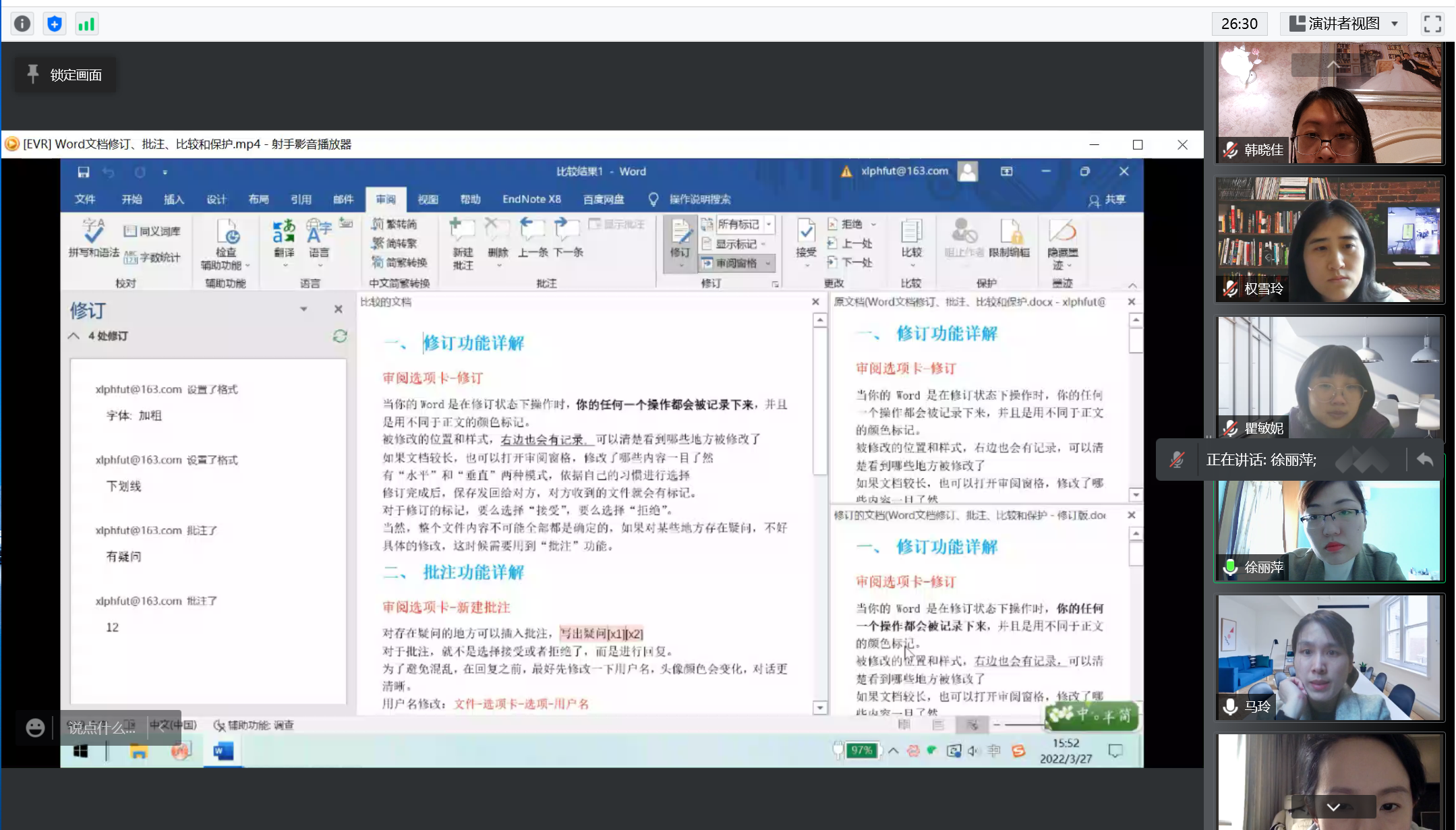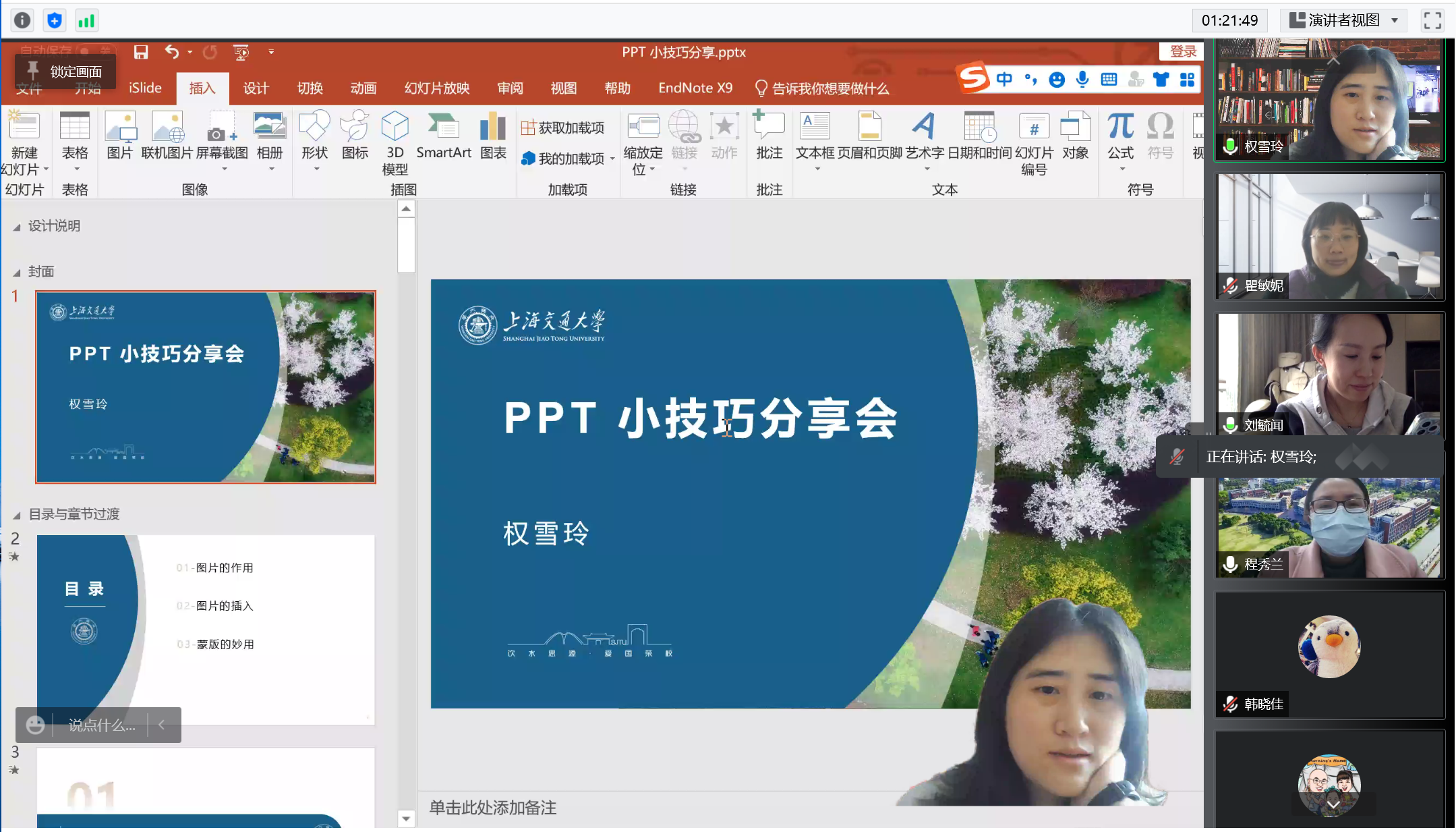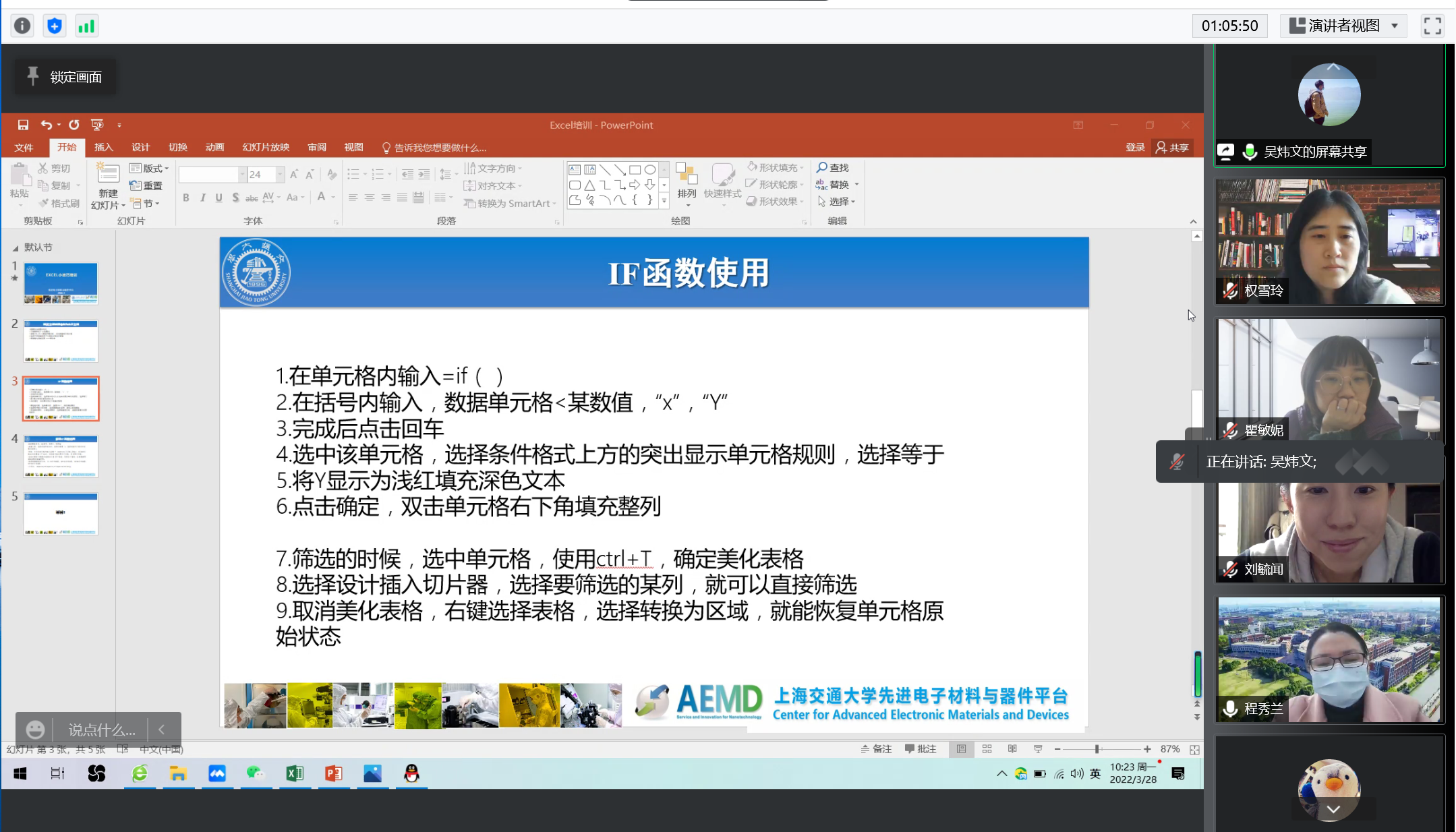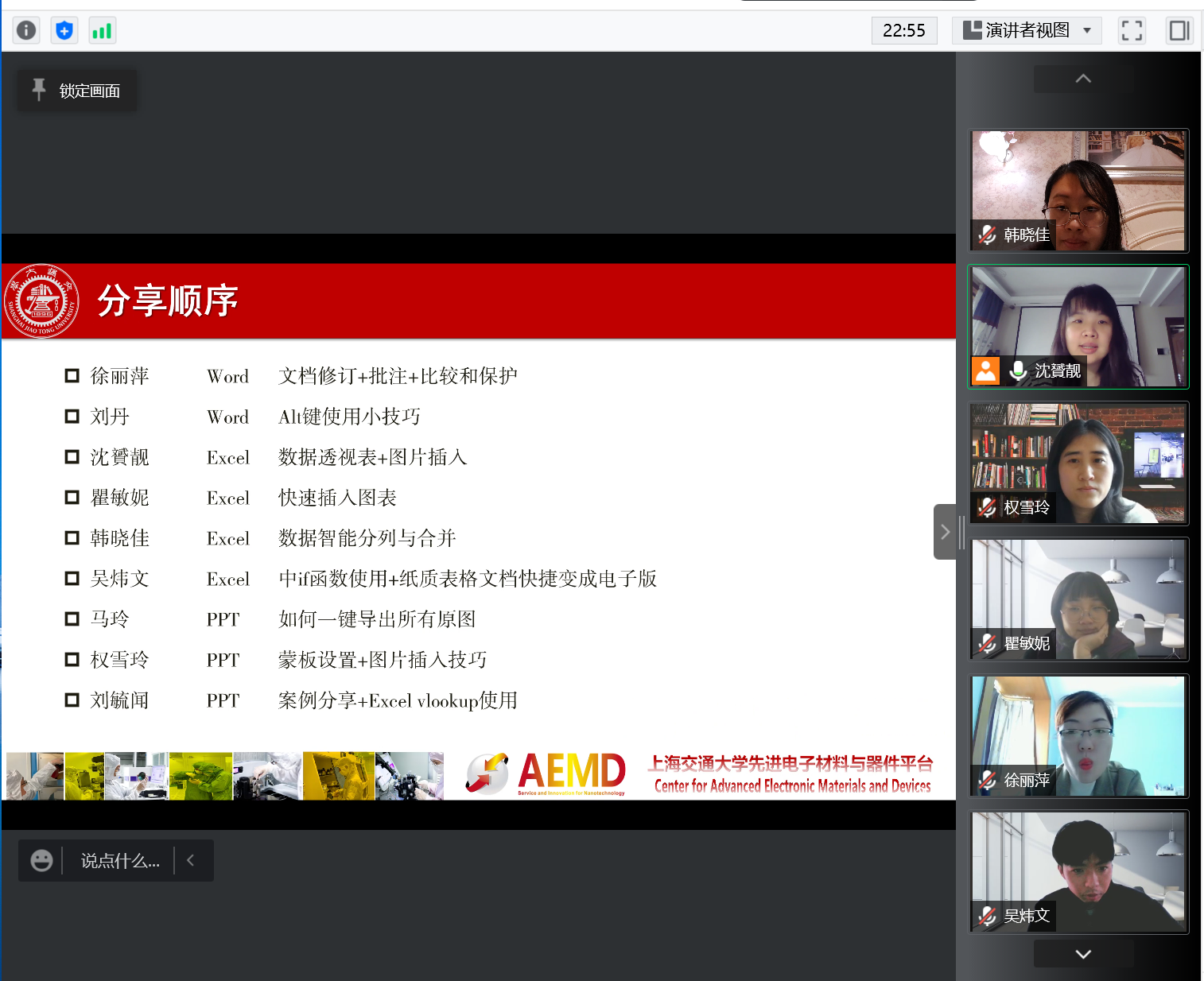 目前仍是校园内外共克时艰、同心战疫的关键阶段,为保证常态化疫情防控要求下的办公效能、优化线上办公能力、提升服务效能,电院AEMD平台直属教工党支部开展在线办公技能“云”分享活动。本次活动以视频会议的形式开展,平台支部每位党员同志准备1-2个office办公软件使用技能,以共享屏幕现场操作、或提前录制小视频的方式进行讲解,除了分享实用技巧外,大家还举例说明该技巧在实际办公中可运用的场景,可谓干货满满,具有丰富的实操意义。