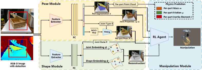 工作简介:本文针对真实世界关节体视觉感知和操作问题,创新性地提出了一个大规模真实世界关节体知识引擎AKB-48,其中包含了48类常见关节物体类别,共计2037个关节体和其对应的知识,相比于现在的真实世界数据集,我们的知识库规模有两个数量级的提升。为了表示视觉感知和操作任务所需要的关节体知识,本文为每个物体建立了一种关节体知识图(ArtiKG),包含物体的外形、结构、语义和物理信息,这些物体知识由我们所构建的快速关节体入库流程FArM采集并标注,平均入库时间在15分钟以内。最终基于该知识库,本文提出了全新的关节体从感知到操作的深度学习框架AKBNet,在类别级关节体的姿态估计、三维重建和操作任务提供了很强的baseline。数据和代码将在//liuliu66.github.io/articulationobjects开源。