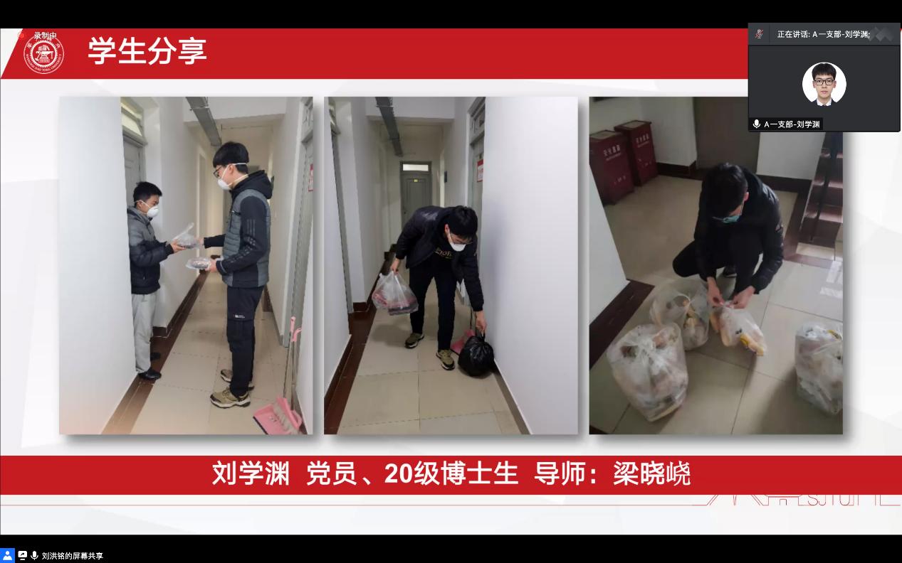 四位学生党员志愿者宦旭、刘学渊、亢虎权、张向阳则分别从驻楼辅导员、楼栋志愿者、年级思政教师、校外线上志愿者的角度,分享了自己从疫情发生到现在的心路历程与相关工作经历。从高效严谨的网格化分工,到细致入微的衣食住行小事;从联络解决同学们的各种需求,到关怀安慰被隔离同学的身心状态;从进驻楼栋投身一线的组织协调工作,到远程线上追踪记录校外同学的状况。几位同学的分享覆盖了疫情防控过程中的方方面面,让同学们能从不同的角度更加全面地了解这次交大战疫过程。