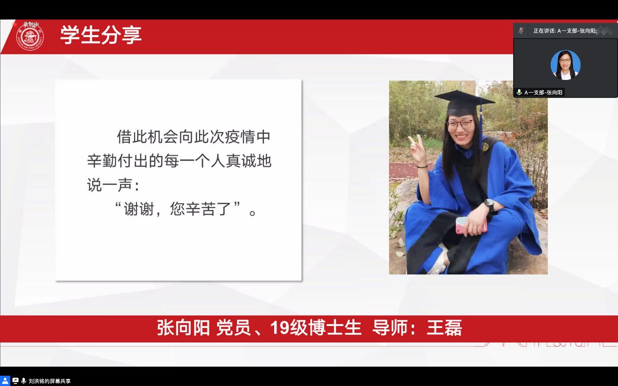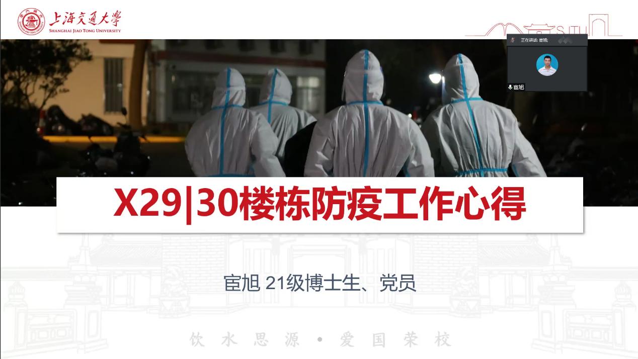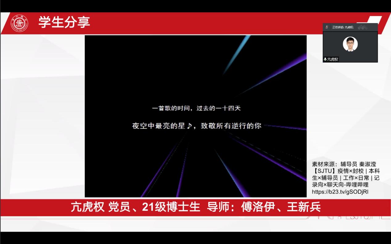 涂仕奎副教授作为校外教师,从多个角度和大家分享了上海疫情防控的所见所感,展示出政府、基层、学校和导师等在战疫过程中的细致、周到和关怀。最后,涂教授呼吁大家坚定信念,相信党和国家,相信上海,相信交大,同时也相信自己,经过此次的历练会变得更加强大和坚韧。
