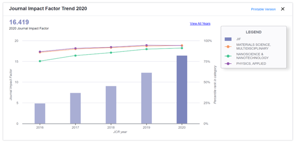 《纳微快报(英文)》在JCR纳米、材料、物理三个学科分区位列Q1区,并位于分区前10%。其中在PhysicsApplied排名 10/160 ,Materials Science Multidiscplinary排名 19/335,Nanoscience & Nanotechnology 排名 10/107 成绩再创新高!