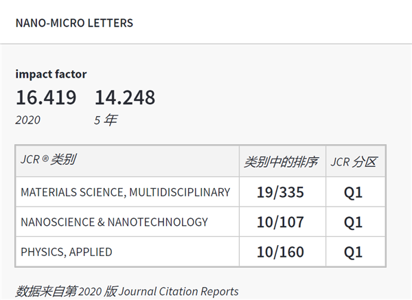 近日,Journal Citation Reports®2020年SCI期刊影响因子IF发布。交大主办,电院承办的英文学术期刊《纳微快报(英文)》Nano-Micro Letters,最新 IF 指数为16.419,