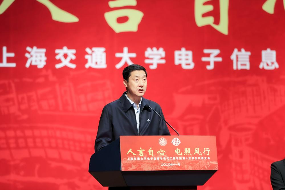 高宇岑代表校学联致辞。他表示电院学子群英荟萃,在学科竞赛、创新创业等领域中均取得优异成绩,希望能通过学代会让各位代表共同参与校园文化建设,为学校、学院的发展壮大不懈努力。