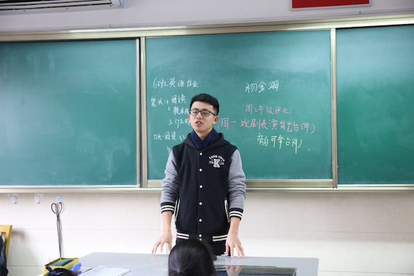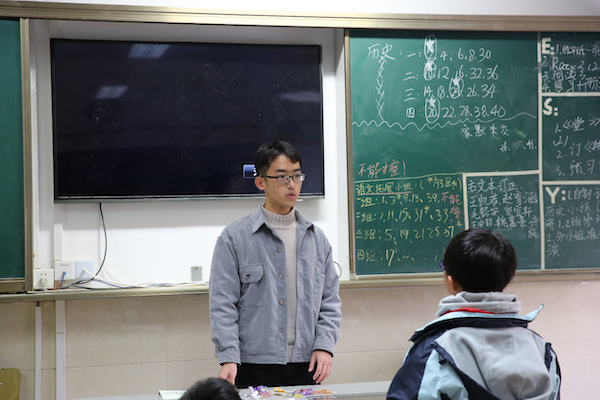 中午十二点,志愿者们去到交大二附中,利用午休和班会的时间,在各班通过演讲和学生提问的方式分享自己的学习经验。志愿者们从自己的学习经历出发,主要围绕正确看待考试成绩、发现学科学习价值、掌握科学学习方法三个主题分享了自己的体会。
