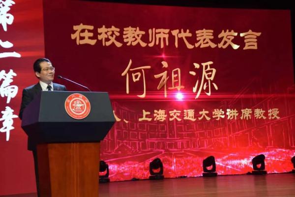 教师代表,国家计划专家、上海交大讲席教授何祖源作为教师代表向学院致以衷心祝贺。何祖源在交大完成了本科和硕士研究生学业,在交大学习度过的难忘时光是他人生中最珍贵的一段经历。他为电院的飞速发展深感自豪,并且向建设电院的教职员工以及前辈们致敬。何祖源表示,作为电院教师,将继续以艰苦创业的拼搏精神、精诚合作的团队精神、润物无声的奉献精神、敢为人先的创新精神,立德树人,教书育人,为学院创建世界一流再铸新的辉煌。