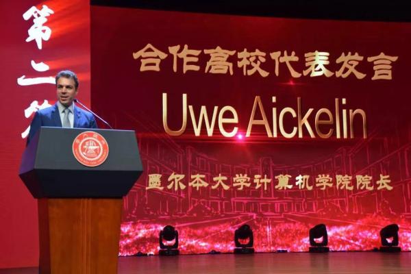 墨尔本大学计算机学院院长Uwe Aickelin教授代表墨尔本大学向电院110周年院庆表示诚挚祝福,他欢迎优秀的交大学子前往墨尔本大学深造,并期待未来与电院有进一步的合作。