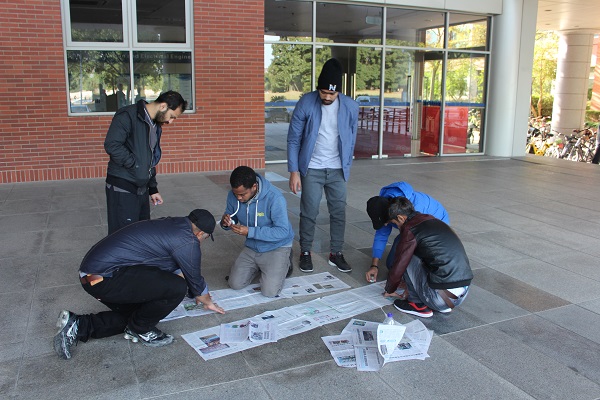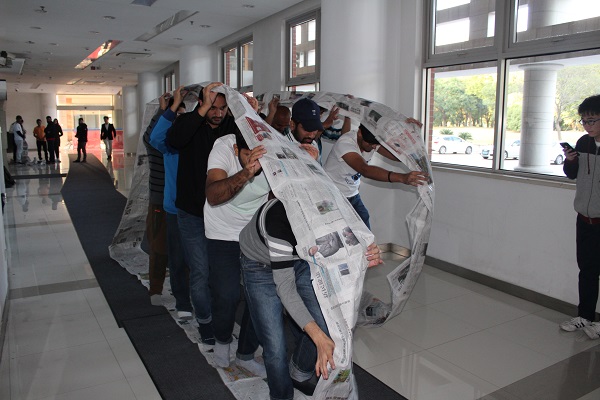 接着,留学生们投入到了“无敌风火轮”的游戏中。各支队伍积极参与其中,各组成员积极交流,发挥各自的想象力,运用有限的器材在一定时间内制作出游戏道具,并在之后的比拼环节中展现了极高的团队协作能力,体会到了团队沟通,相互帮助的重要性。