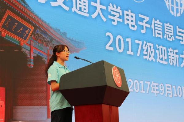 电院2017级柏钦雯作为新生代表发言。她首先对多年来默默付出的家长与老师表示感谢,并祝贺同学们来到交大这个世界一流学府。她表示身为交大学子,拥有更优秀的学习伙伴,享受着更优质的课堂和师资,就要以更坚定、更从容、更自信的姿态面对未来。