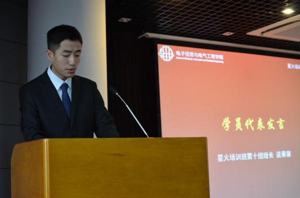 第五期星火班第十组组长谈果馨代表学员发言。他分享了自己因转专业而第二次成为入党申请人的独特经历,表达了再次以崭新的面貌参加星火培训班时心中的激动之情。他引用了校党委副书记朱健的讲话:“组织上入党是一生一次,思想上入党是一生一世。”他以亲身经历,指出了党员在社会活动中的积极作用。他表明,党不是单纯的政治产物,它拥有着坚实的理论基础;共产主义不是一个幌子,实现共产主义是切实可行的。他代表学员承诺,一定会刻苦钻研,进一步提高思想政治修养。