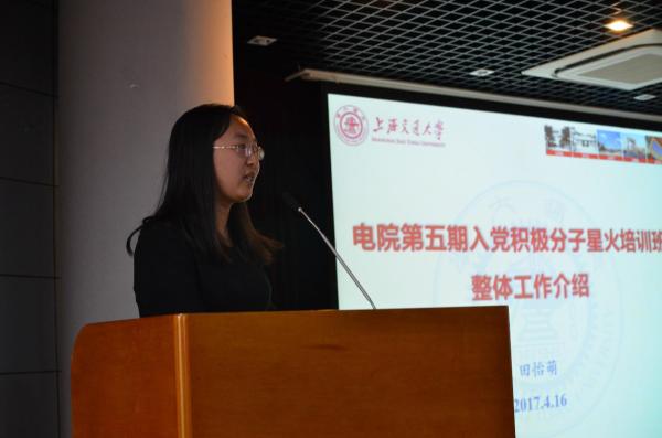 田怡萌对同学们成为星火培训班学员表示了祝贺,并对培训班的工作、电院入党积极分子考察体系做出了具体的介绍。她以“我是谁”、“我为什么要来”、“我来做什么”为引子,分别介绍了一名正式党员必经的成长历程、大学生党员参与理论培训的重要性以及本次培训班的课程设置,并对学员表达了学有所思、思有所悟、悟有所行的良好祝愿。
