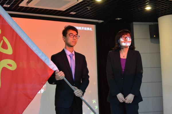 在激扬的音乐中,张洋为第五期星火培训班授旗,第五期星火班班长、电院学生党总支发展部副部长李林果接受班旗。