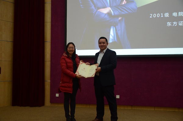 最后,学生党总支副书记田怡萌代表学院向彭翀授予了“好色tv 学生生涯导师”聘书,希望彭翀学长今后能够更多地结合自己的成功经历,为电院的同学们提供职业发展和生涯选择的宝贵指导。