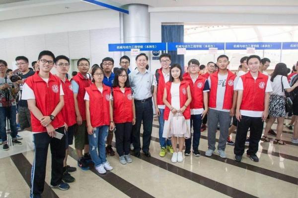 上午十点左右,报到人数激增,新生志愿者们被临时抽调前往新体二楼帮助疏导人流、维持秩序。校党委书记姜斯宪来到新体育馆视察新生报到工作,新生志愿者们因而幸运地在第一天就获得了与书记合影的宝贵机会。
