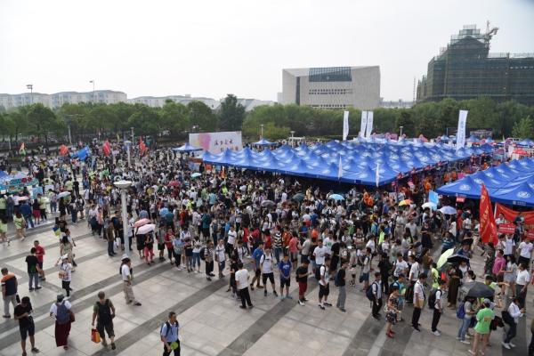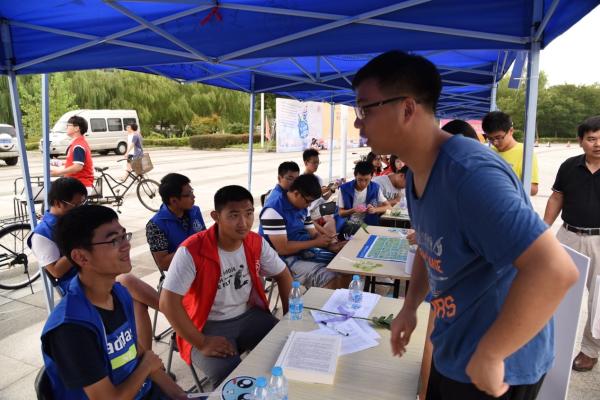 中午十一点,新体广场上排队的人仍不见少,不少刚刚赶来的新生和家长拖着大箱小箱的行李,看着拥挤的人群,露出些许不知所措的神色。新体帐篷组的志愿者们为他们答疑解惑,耐心详尽地回答了各种问题,包括校园卡如何激活如何充值,电院何时分专业,去哪失物招领,等等。热气灼人,志愿者们还为前来咨询的新生和家长奉上解渴的矿泉水,并提供行李寄存等贴心服务。