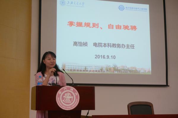 高怡祯做题为“掌控关键,大胆放飞”的报告。在对学校及学院的日常管理规章制度进行简要介绍后,她就“帮助新生自立自强”、“帮助新生自我规划”以及“帮助新生掌握规则”三个问题对学院的育人理念和育人方式进行了详细解读。报告最后,高怡祯提出“角色转换、心理调适、找到定位、确立目标”的十六字箴言,希望新生可以早日规划今后发展方向并合理安排大学生活。