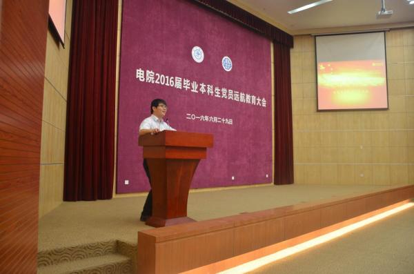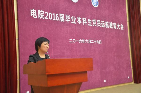 6月29日下午,好色tv 2016届毕业本科生党员远航教育大会在微电子学院一楼演播厅举行。学指委副秘书长、学生处副处长蒋立峰,院党委副书记杨一帆,院党委副书记李劲湘,以及电院全体思政教师、辅导员与学院2016届全体本科毕业生党员出席大会。大会由F12级党建指导教师杨帆主持。