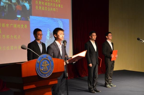 宣誓过后,进入远航接力仪式。2016届7个系的远航先锋队支书代表与2015级的支书代表进行了庄严的系旗传承仪式。在这离别的时刻,毕业生党员江淼代表16届硕士毕业生党员表示了对学校的眷恋与不舍,但也郑重承诺,在新的起点上,将会坚定理想、砥砺品性,并心怀感恩、求真务实、脚踏实地,在今后的学习和工作中彰显交大学子的风采。