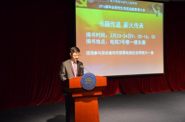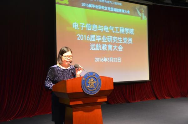3月22日下午,电院2016届硕士毕业生党员远航教育大会在光彪楼多功能厅隆重举行,校组织部副部长王震、学生处副处长蒋立峰、校党委组织部老师解志韬、学指委学生党建科老师张洋,电院党委副书记杨一帆、党委副书记李劲湘,以及学院全体学生党建指导教室和2016届毕业研究生思政教师出席大会。大会由电院学生党建办公室老师梁玉杰主持。