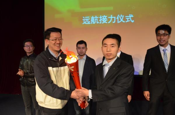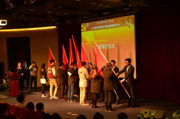 在系旗从16届的远航先锋队支书代表传递到15级支书代表的这一刻起,16届硕士毕业生党员在学校的任务便已完成,但作为交大最年轻的一批校友,即将迈向社会的他们将在校外为学校承担起新的责任,因此,学生处副处长蒋立峰代表学院授予16届全体党员责任的火炬,希望各位党员能在新的工作岗位上继续勤学、修德、明辨、笃实,传承电院之光、发扬交大精神。