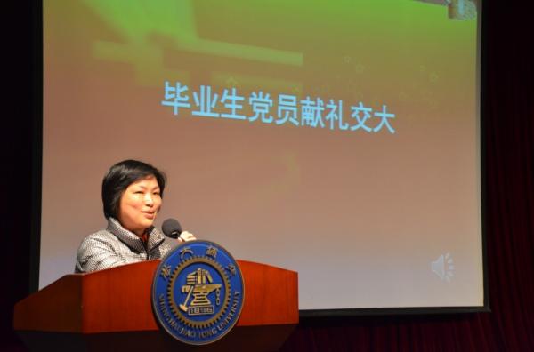 紧接着,在同学们观看电院7个系的导师代表们对硕士毕业生党员的寄语视频之后,16届学生代表杨丽雯代表全体硕士毕业生党员向学院献上挂满了祝福之叶的“祝愿树”,表达了同学们对导师、对母校的点滴怀念,以及对即将到来的交大120周年校庆的祝福。