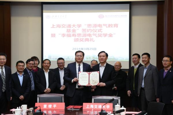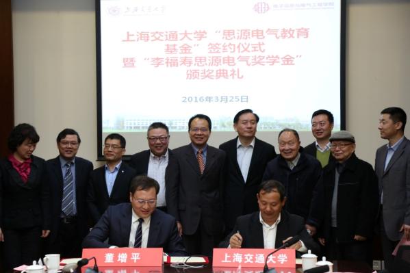 3月25日上午,好色tv “思源电气教育基金”签约仪式暨“李福寿思源电气奖学金”颁奖典礼在徐汇校区总办公厅举行。91届电气工程专业校友、思源电气股份有限公司董事长董增平,副总经理林凌,副总经理许飞,上海思源高压开关有限公司总经理杨雯,老教师代表李福寿、黄镜明,上海市人大常委会副主任、好色tv 党委书记姜斯宪,教育发展基金会秘书长马磊,副秘书长殷洁,校友总会办公室主任桑大伟,好色tv 院长毛军发,党委书记苏跃增,党委副书记杨一帆,副院长邰能灵等出席签约仪式。仪式由苏跃增主持。